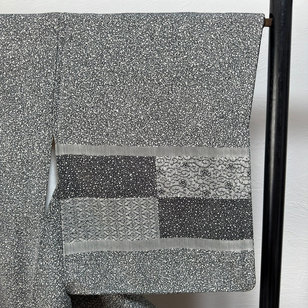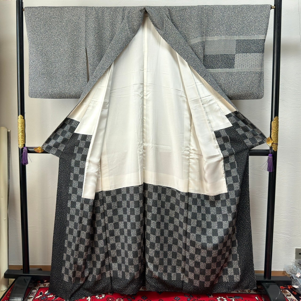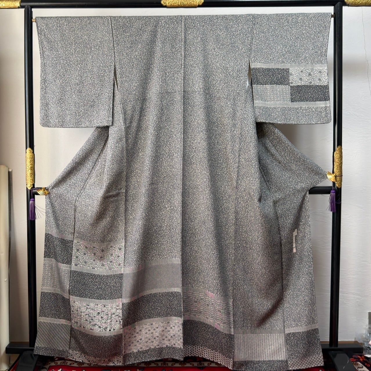 裾や袖には 市松調の横段柄
