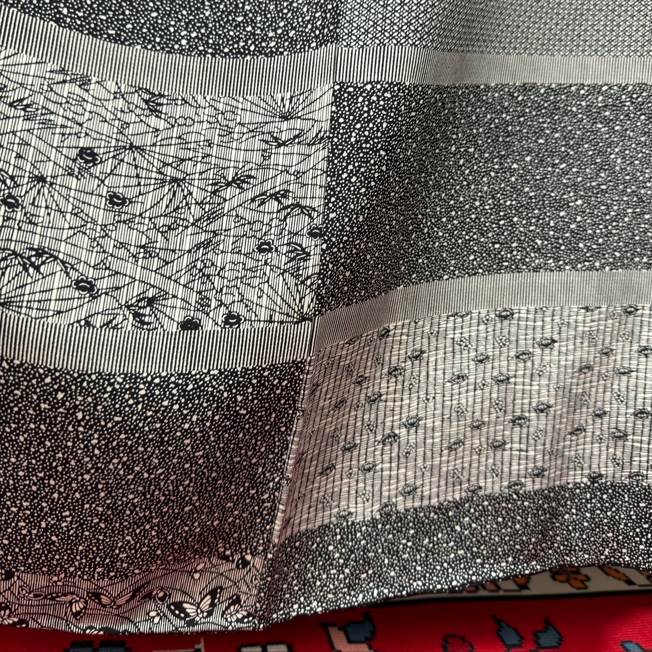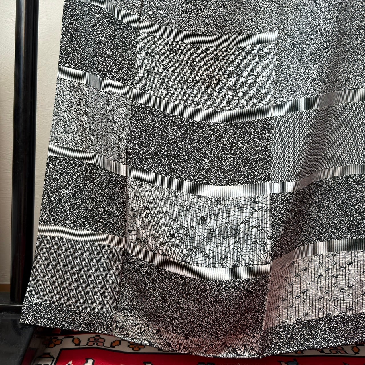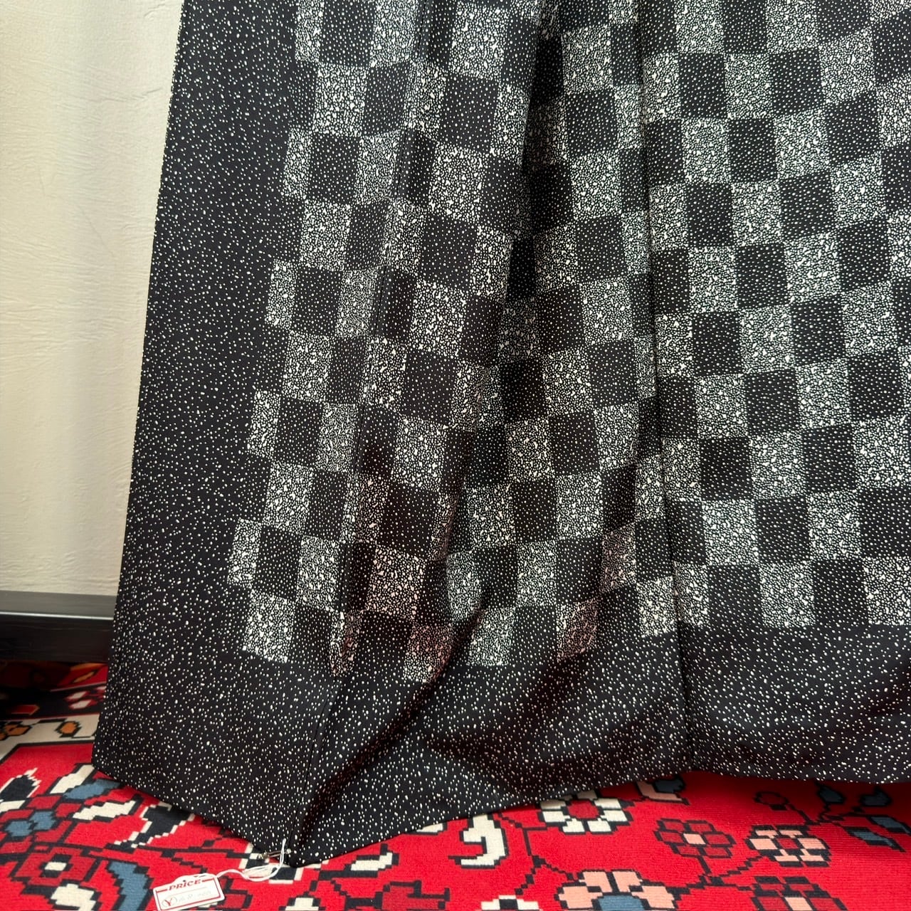 裾や袖には 市松調の横段柄