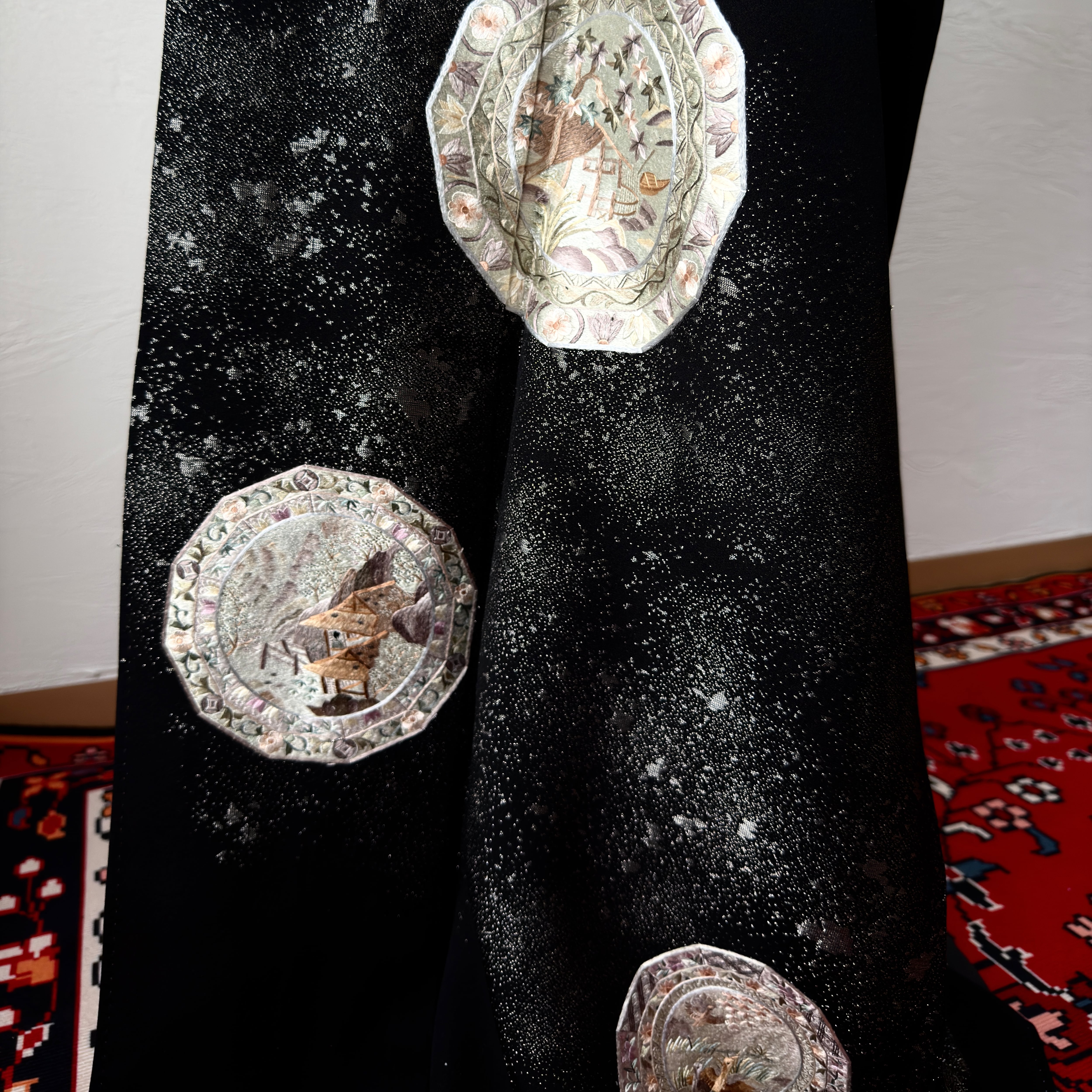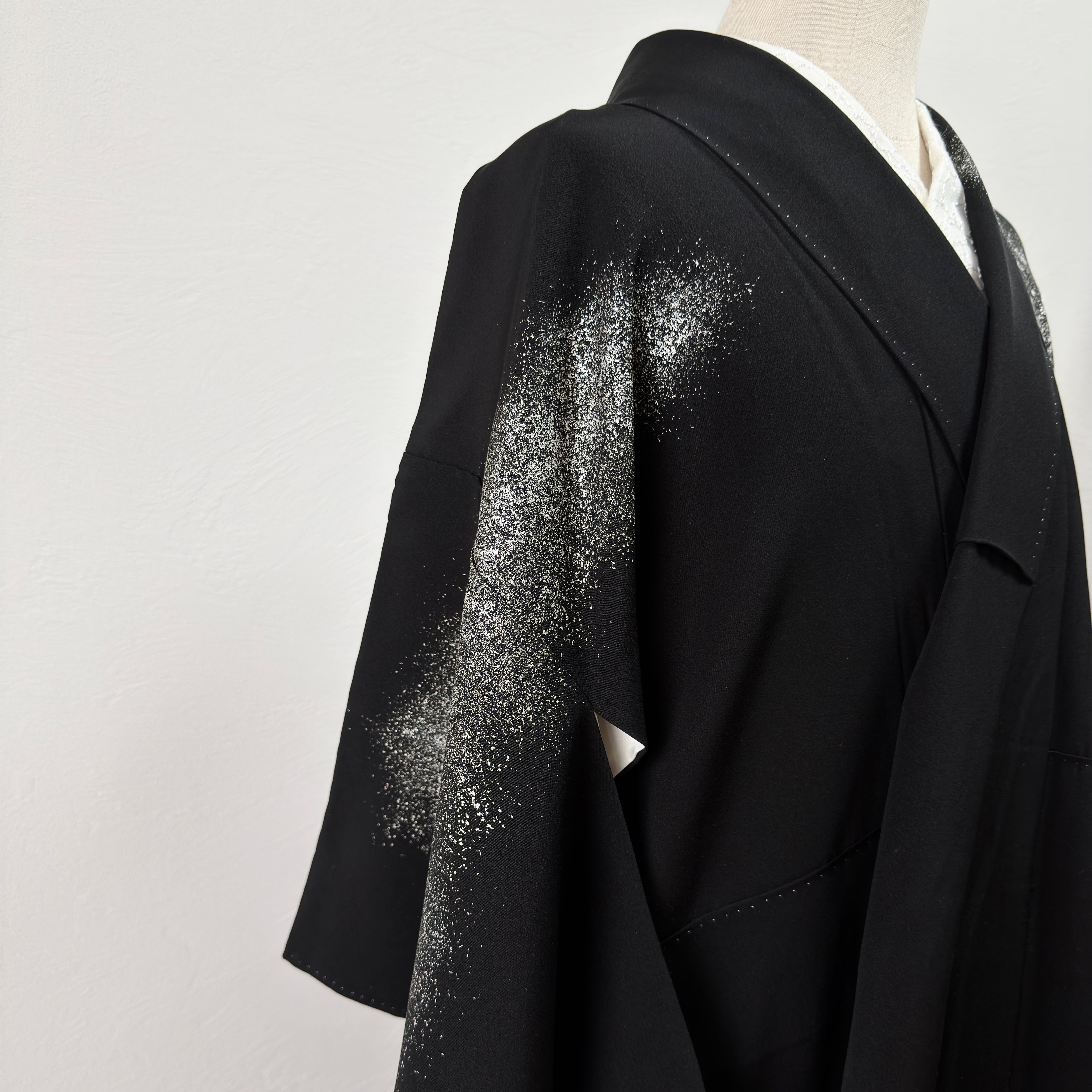 裾一面に広がる刺繍の銀彩が華やかさを添え、