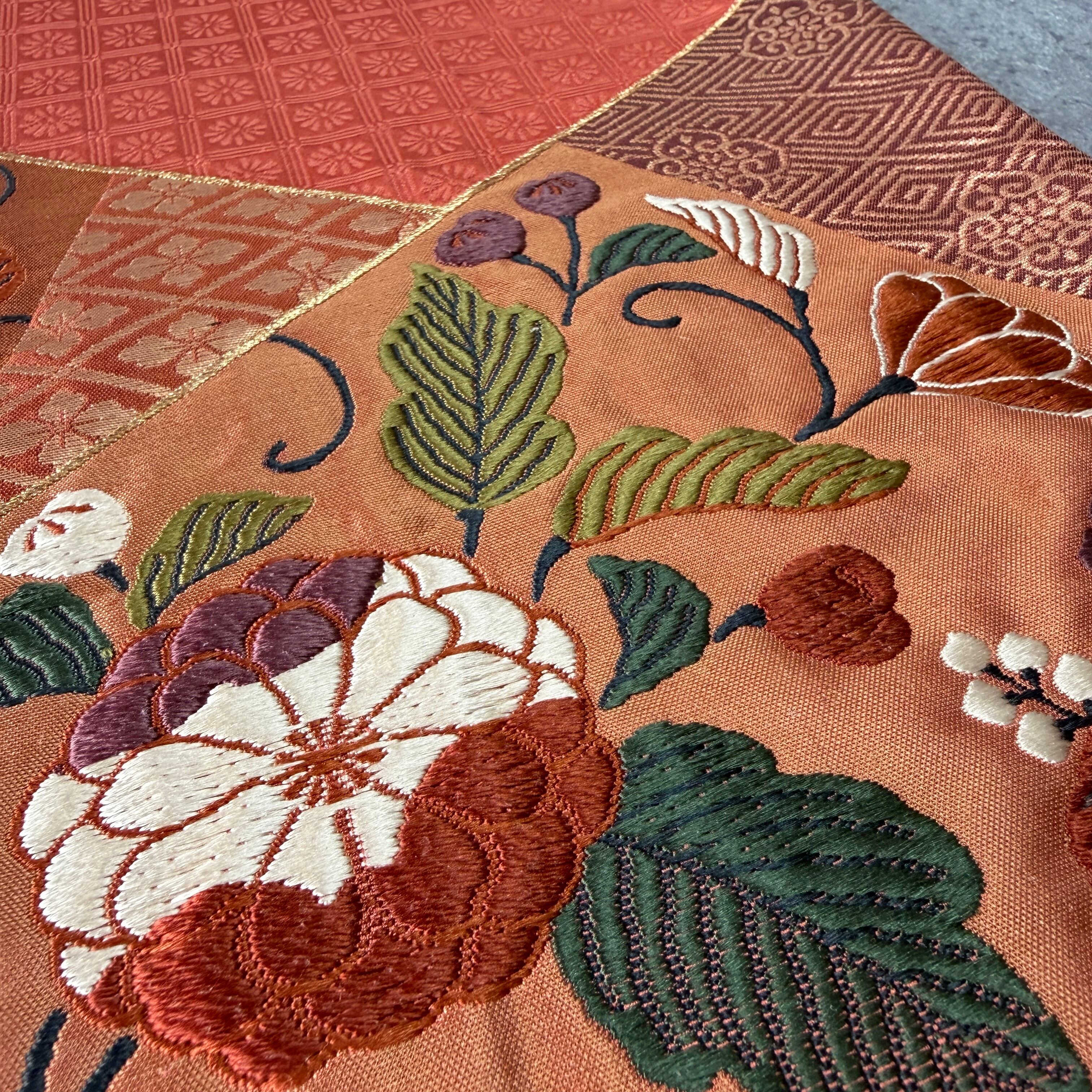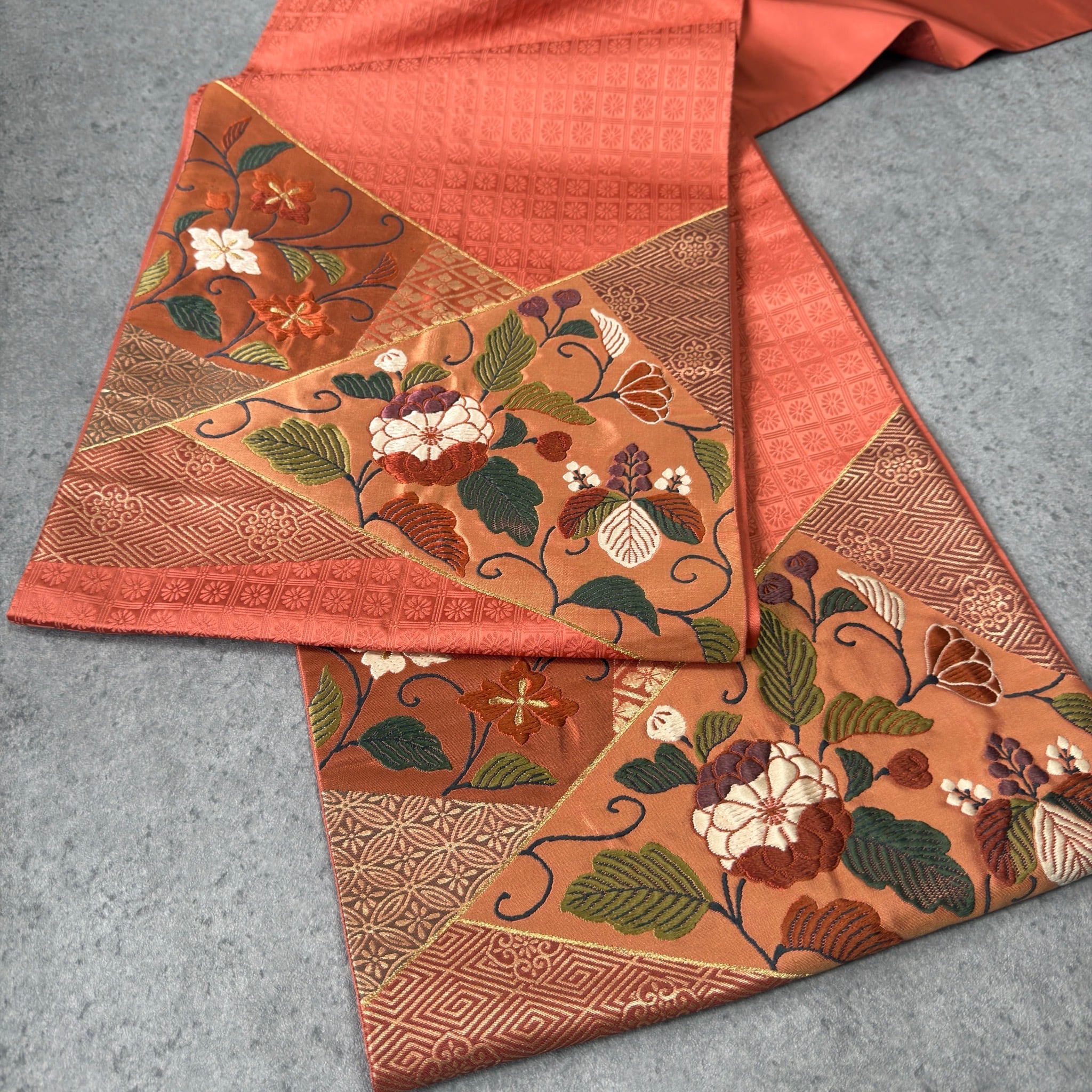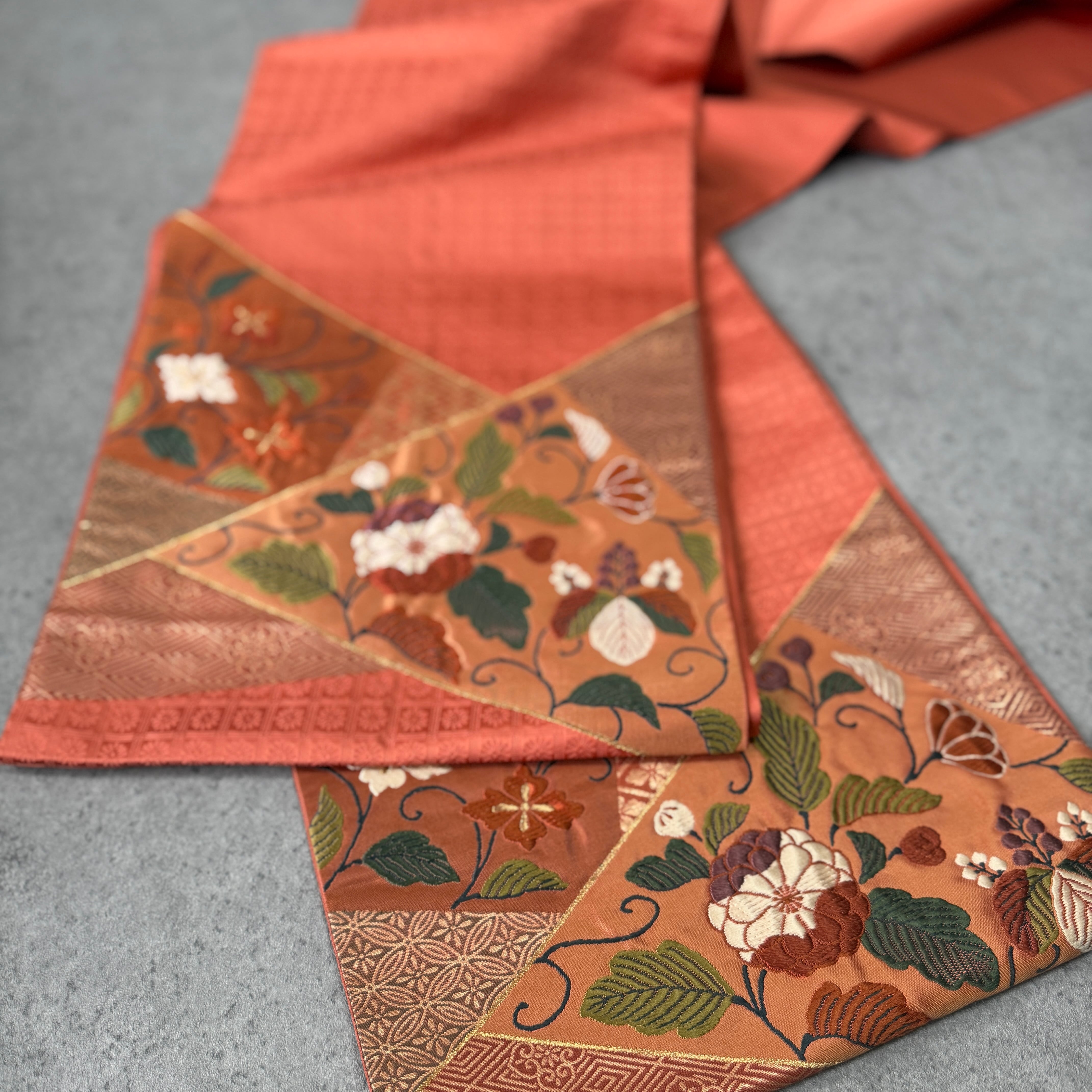 〈袋帯〉唐織⭐︎斜め取切替×唐花文様 袋帯(珊瑚橙)(ヲ)