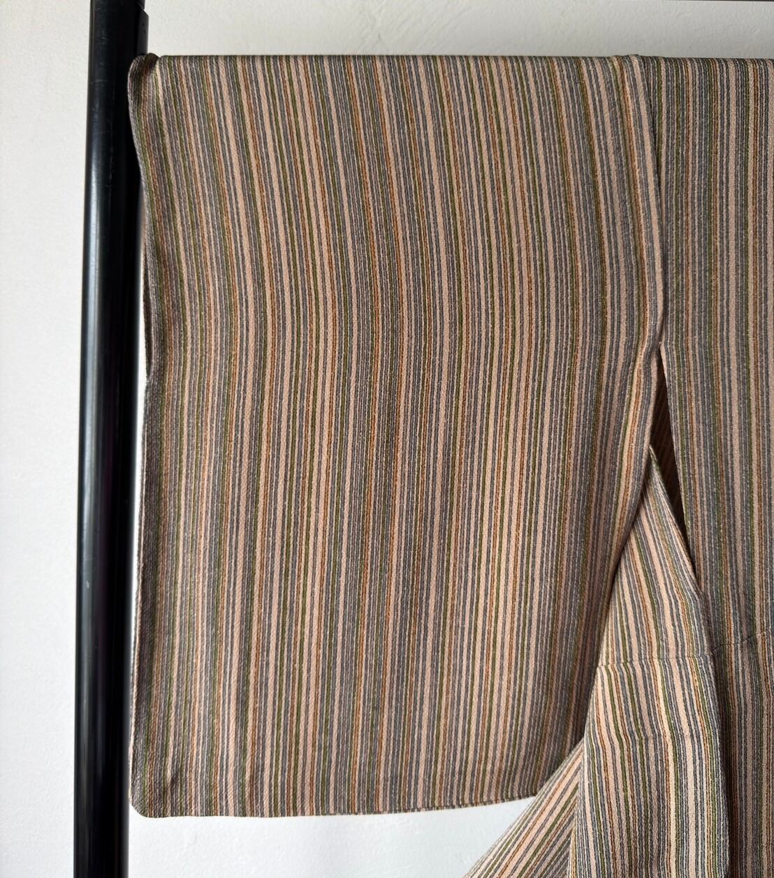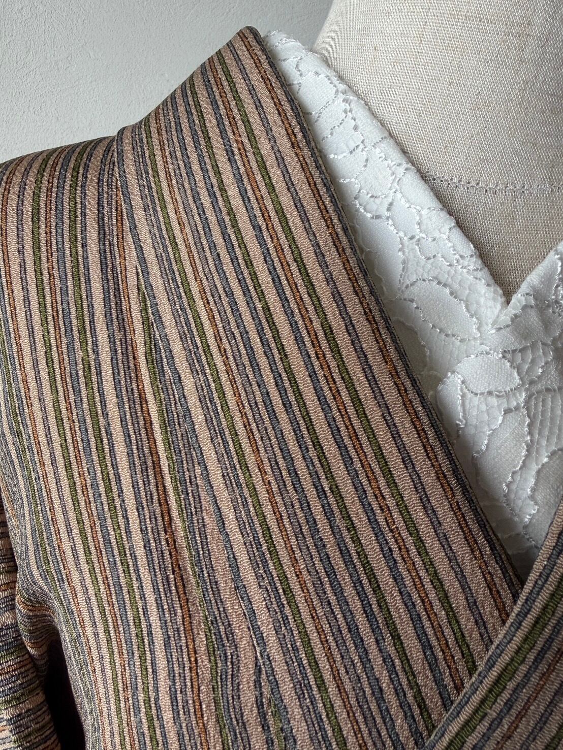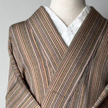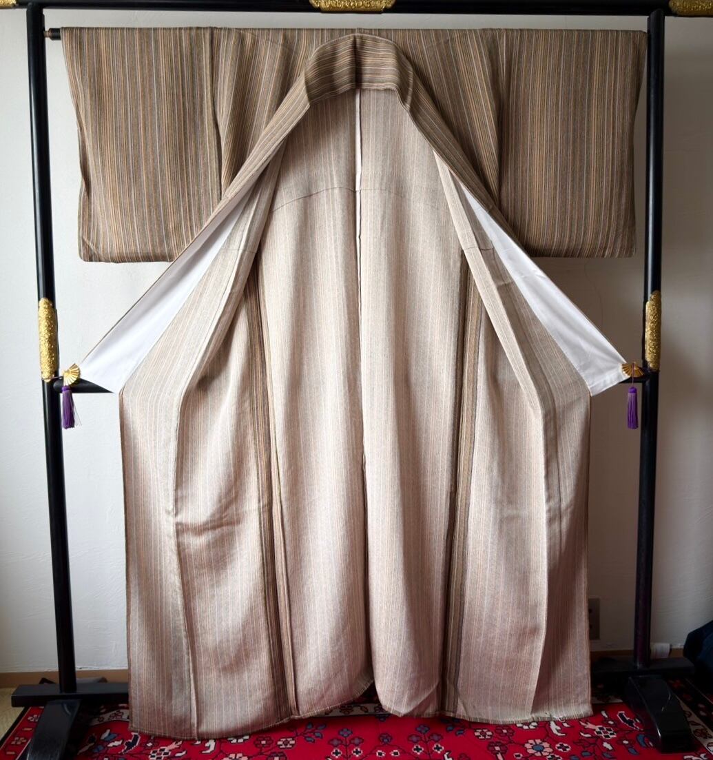 〈単衣〉モカ色ちりめん☆手書き風縦縞(ストライプ)(カ)