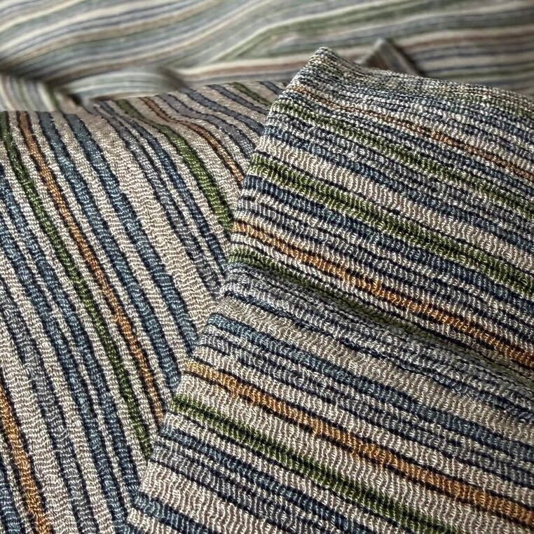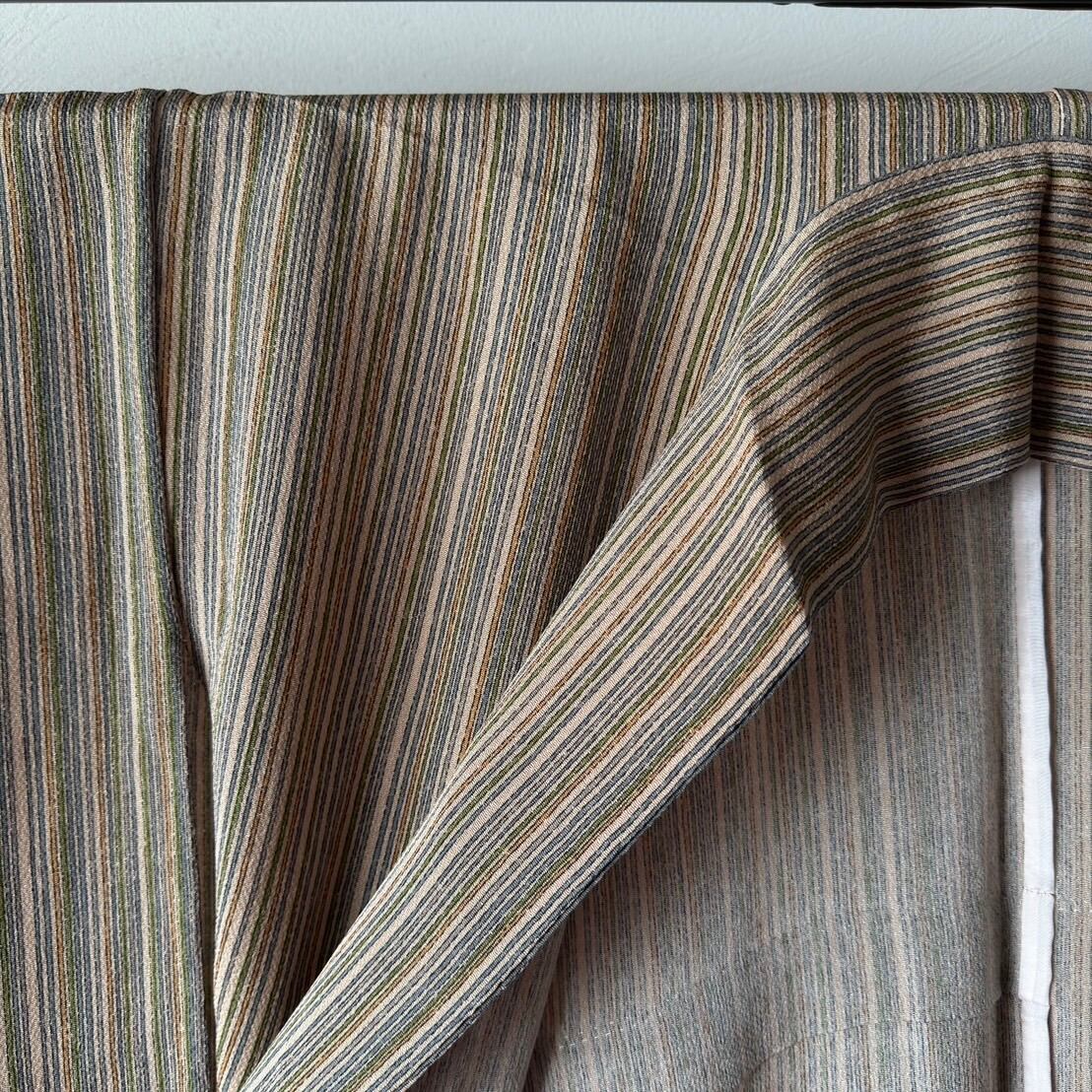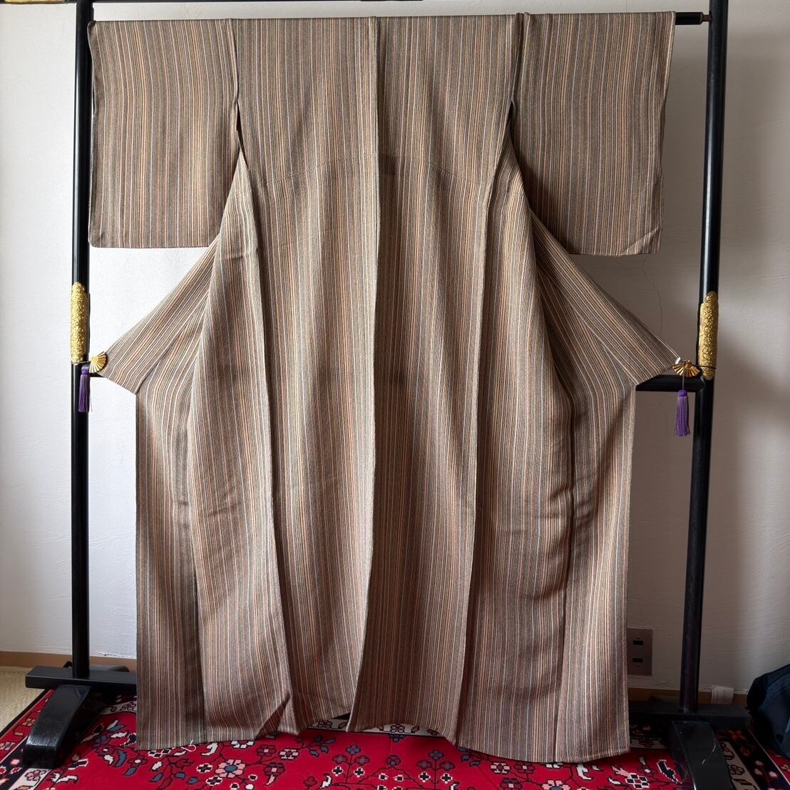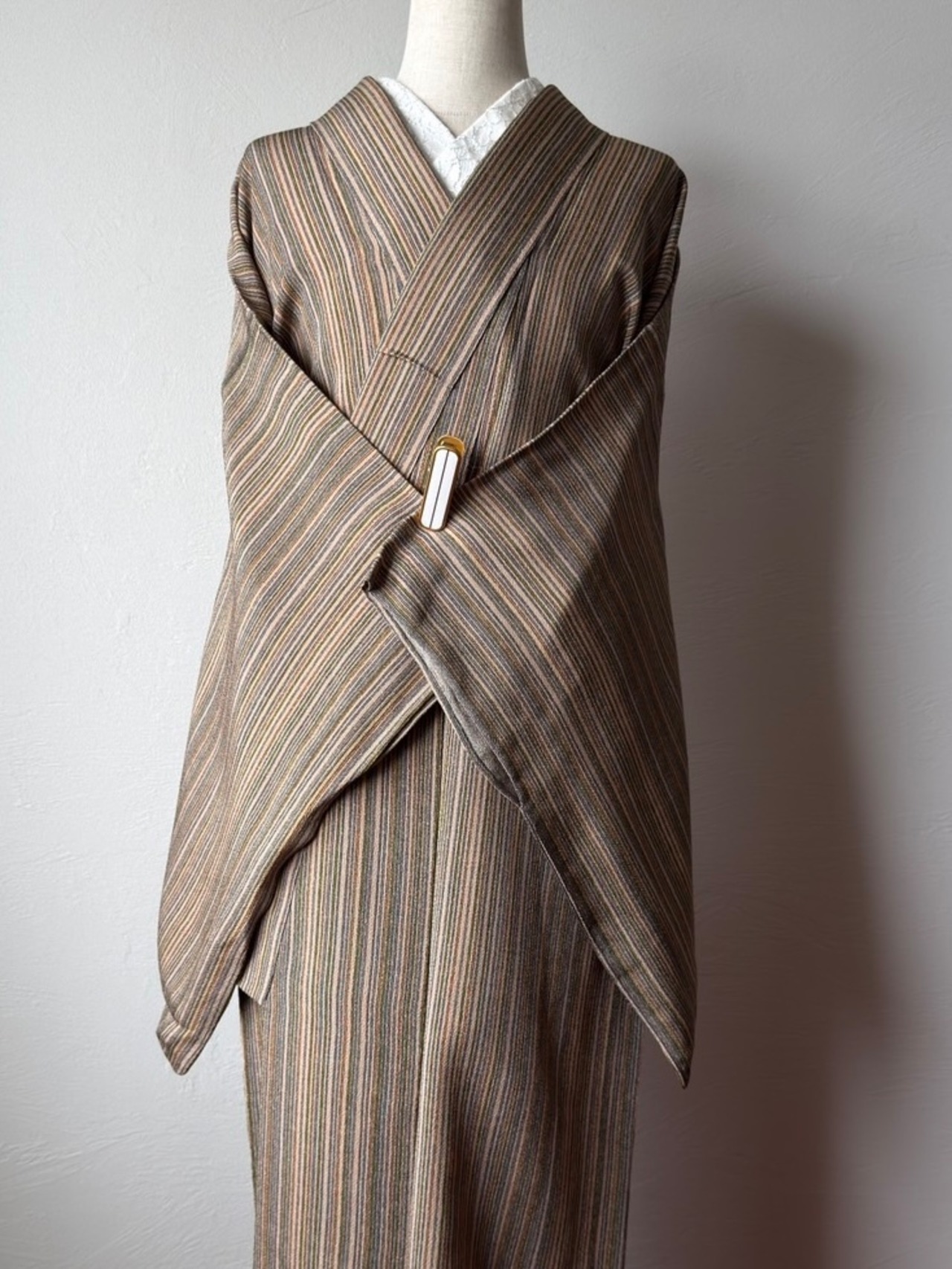 〈単衣〉モカ色ちりめん☆手書き風縦縞(ストライプ)(カ)