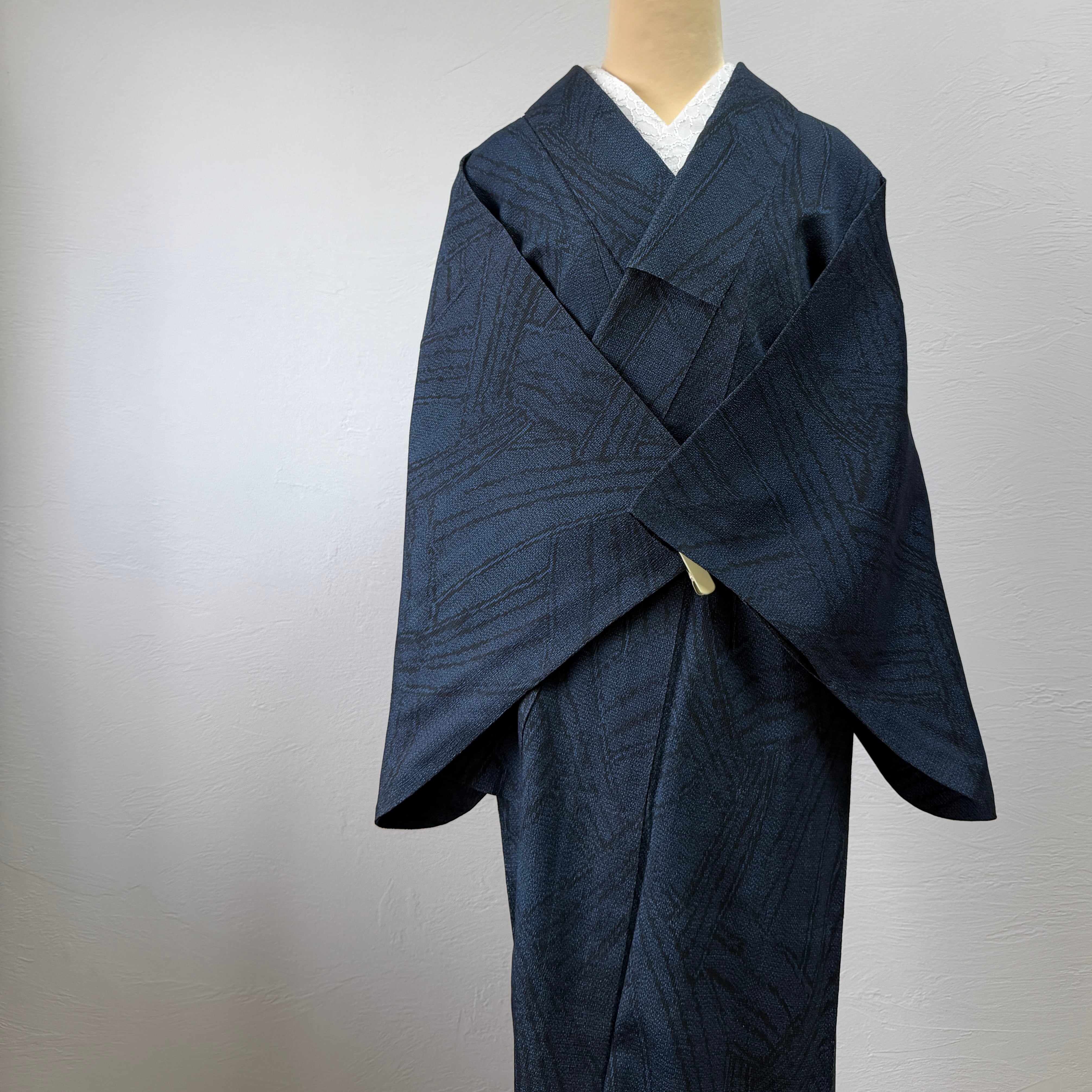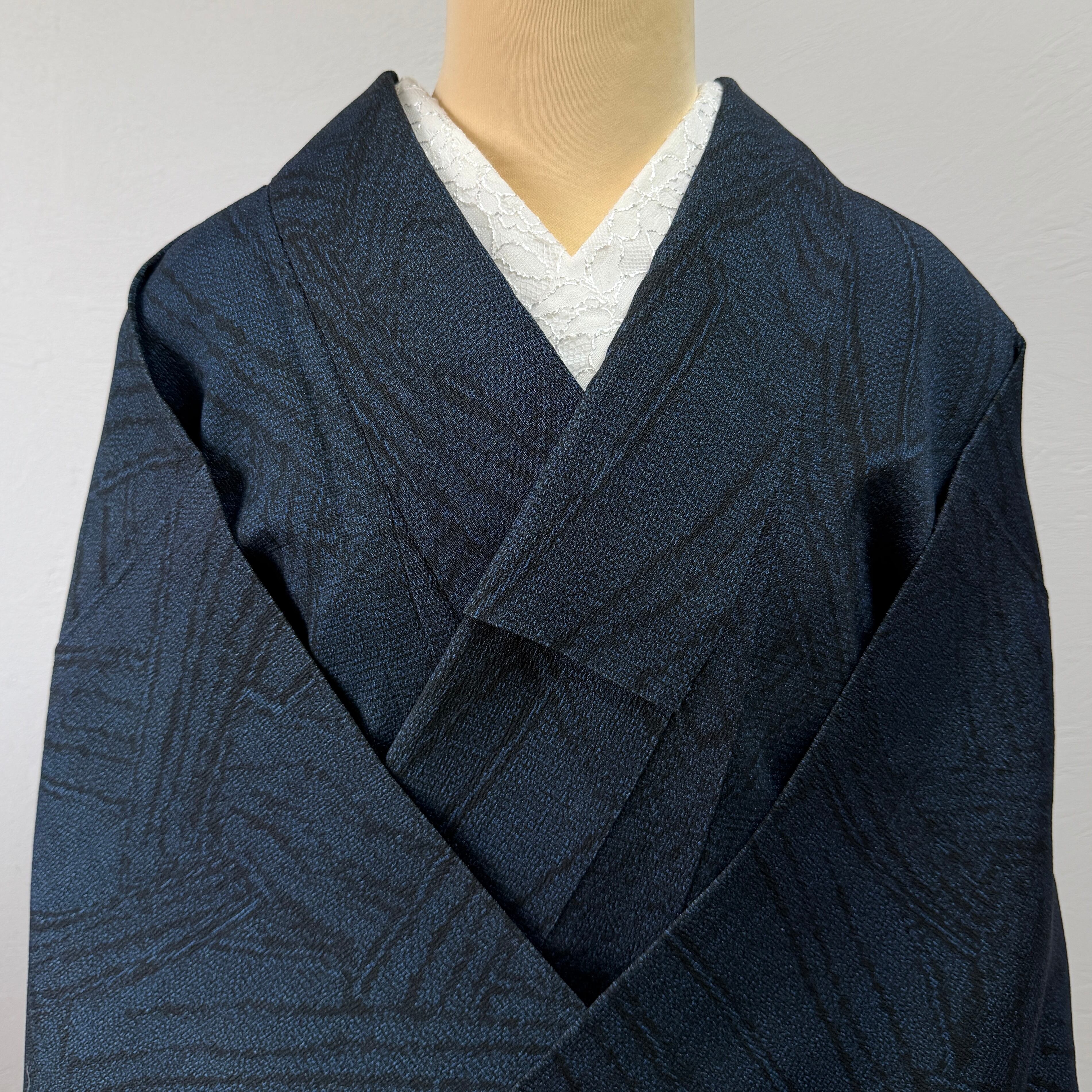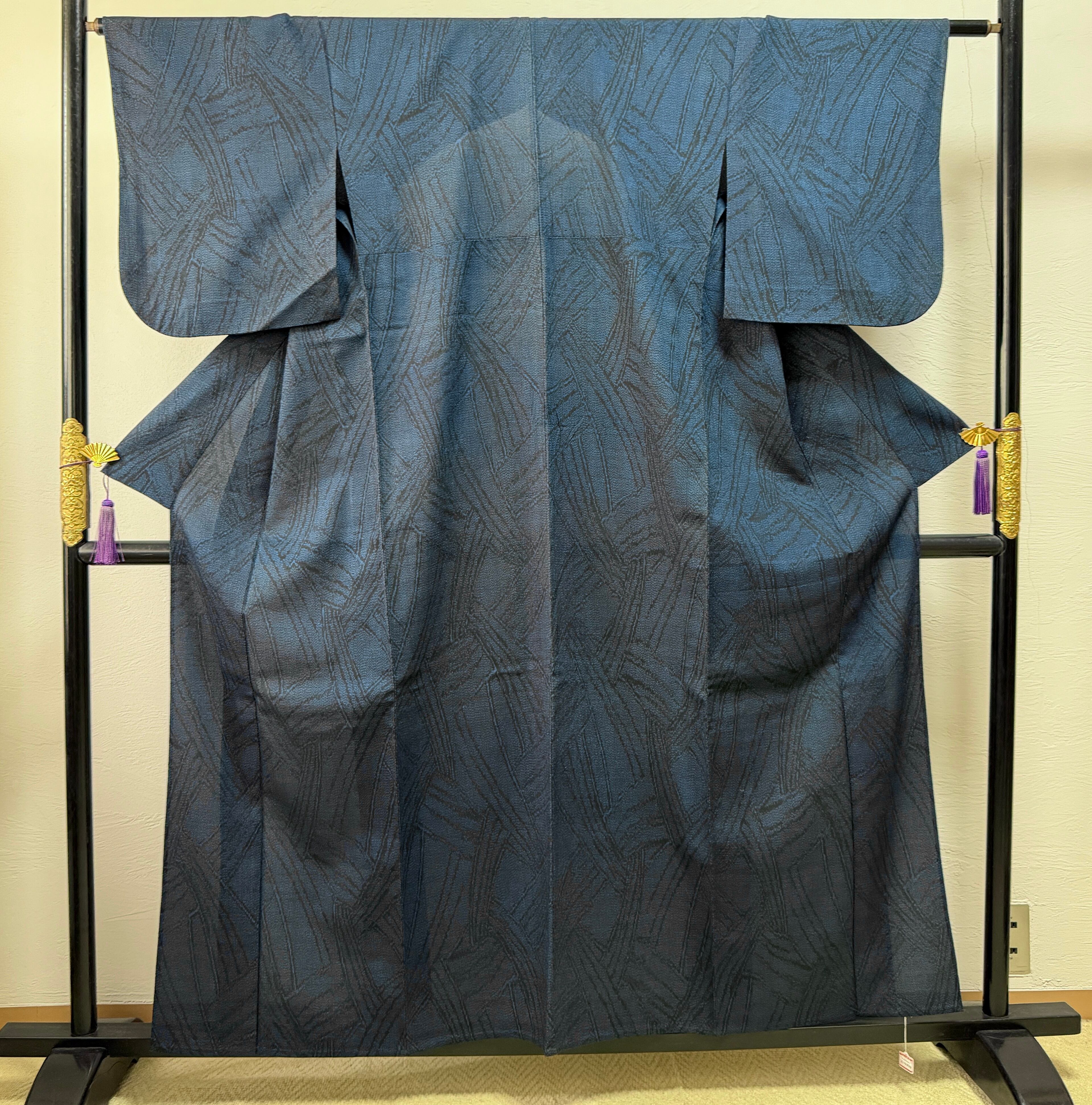 【単衣 紬 正絹】ダークネイビー系 織柄 シンプル おしゃれ着 カジュアル 着回し万能 観劇 食事会 普段着 身丈158cm えり少々よごれ(マ)